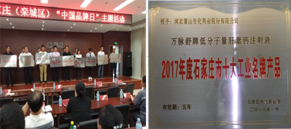 2017年10月16日石家庄市人民政府办公厅发布“关于组织开展2017年度十大工业名牌产品暨百项知名品牌工业产品申报工作的通知”(石政办传【2017】139号)文件。我司按照文件要求,将低钙注射液的相关材料上报至石家庄市质量技术监督局。经过资格审查、资料评审、问卷调查、综合提名、审议、公示等多个环节的激烈竞争,我司“低钙注射液”最终在2018年1月荣获“石家庄市十大工业名牌产品”的荣誉称号。石家庄市政府给予我司20万元的资金奖励,并在5月10日举办的石家庄“中国品牌日”主题活动中,为我司颁发了奖牌。